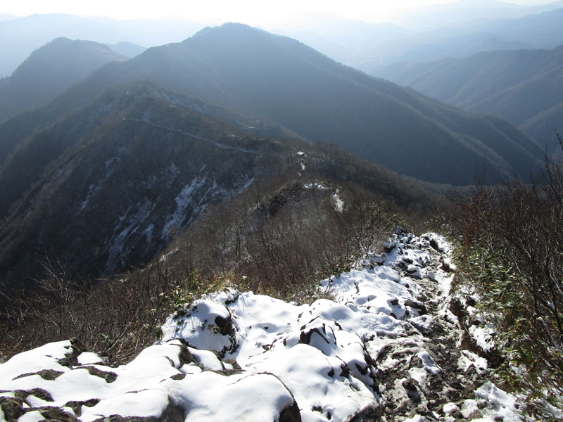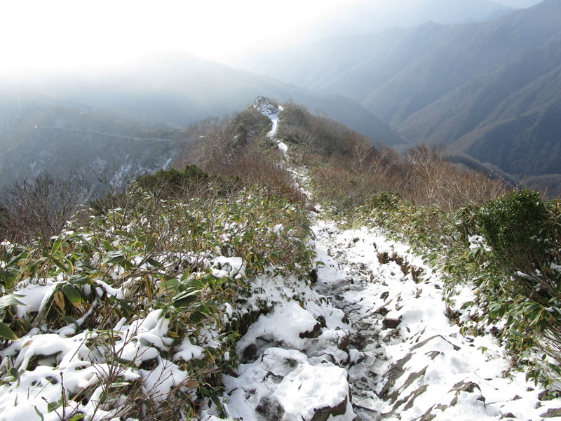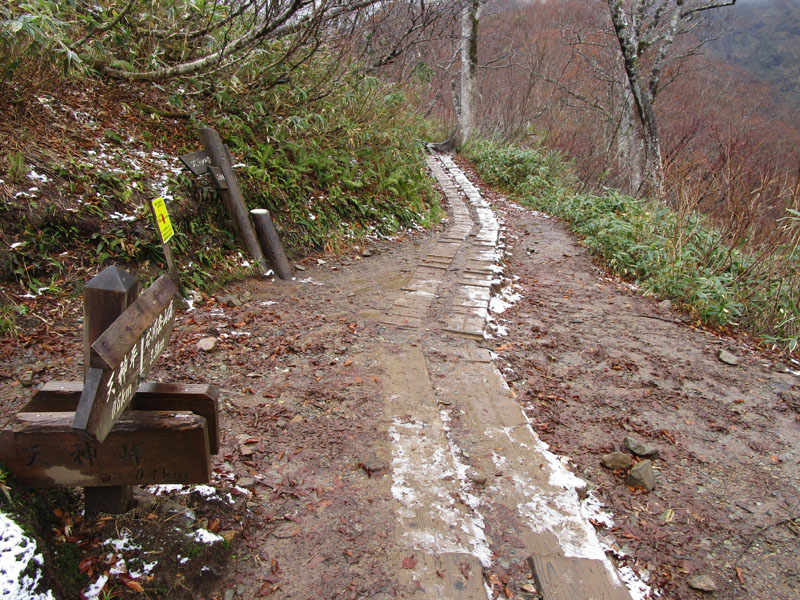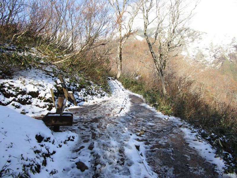 雪は吹き溜まりで20cm程度。このくらいなら下山するにはひざにやさしい。