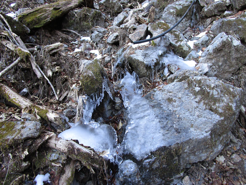 小屋の水源地を探ると、水源地付近では生きていて、ホースから水が出ている。