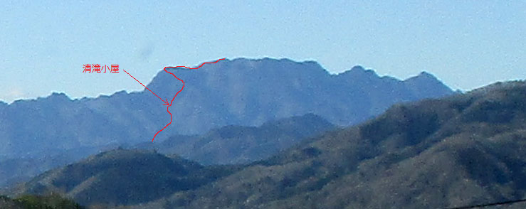 今回登る日向大谷ルートが赤線、途中に清滝小屋、赤線の先端が頂上だ。