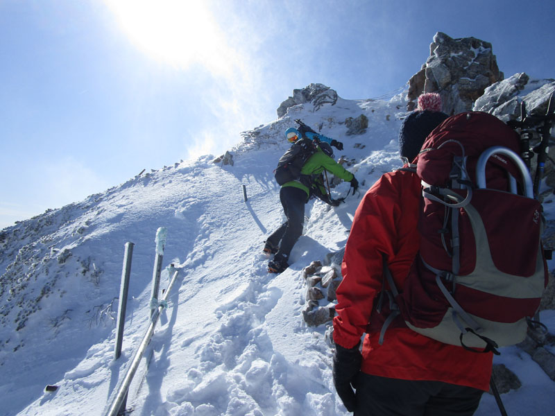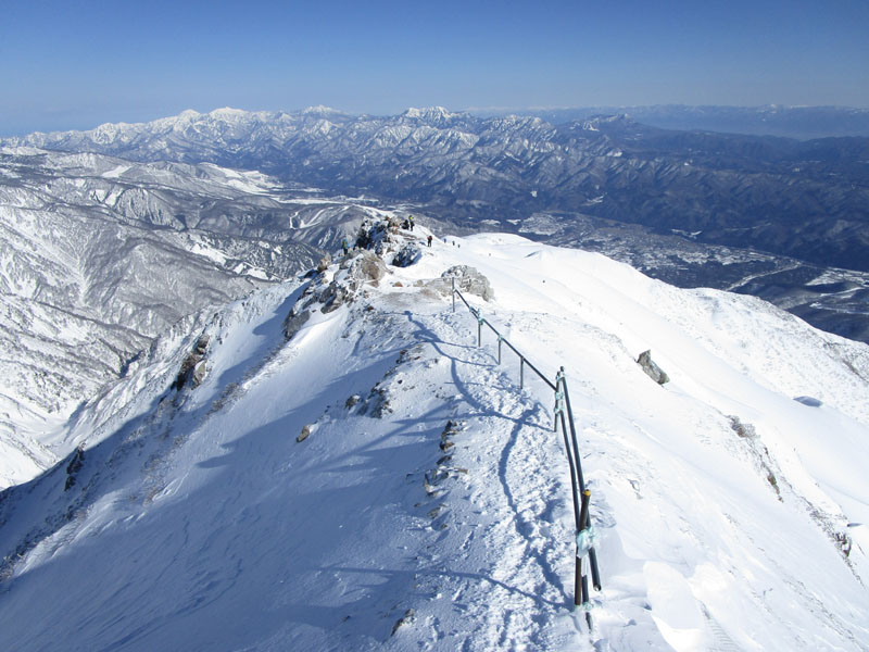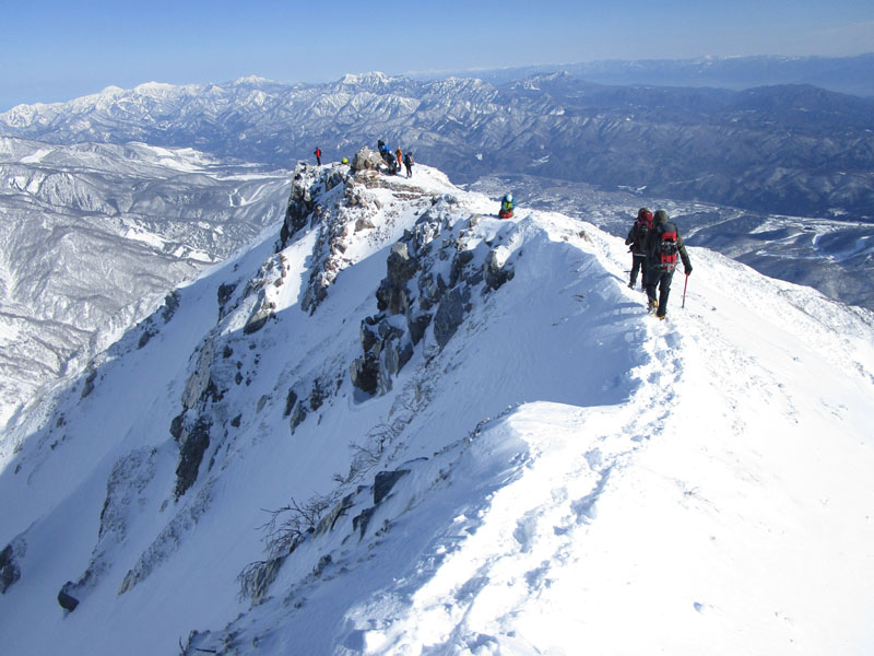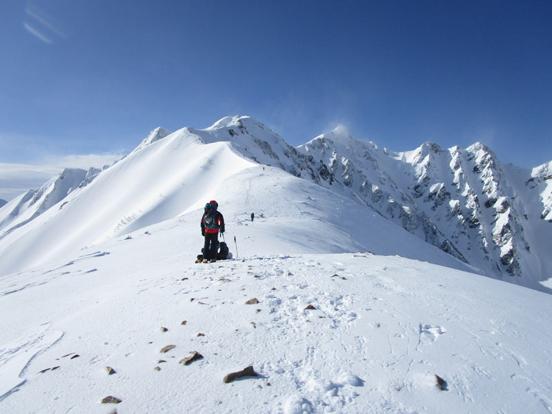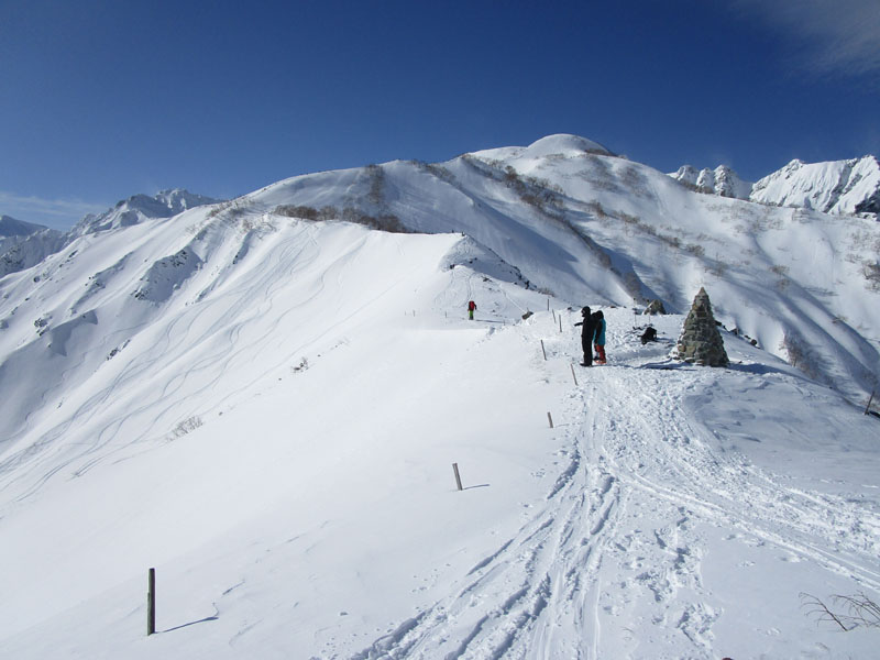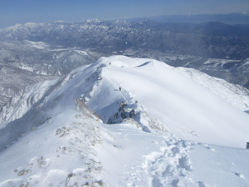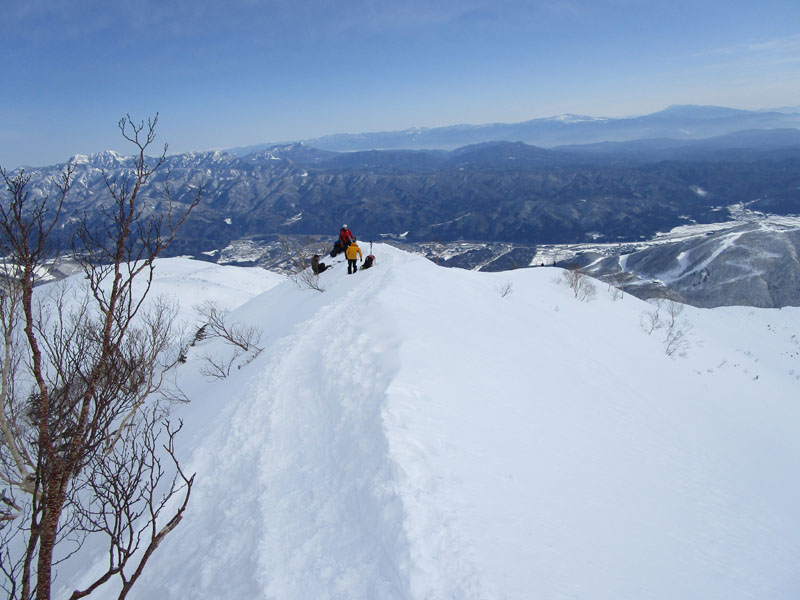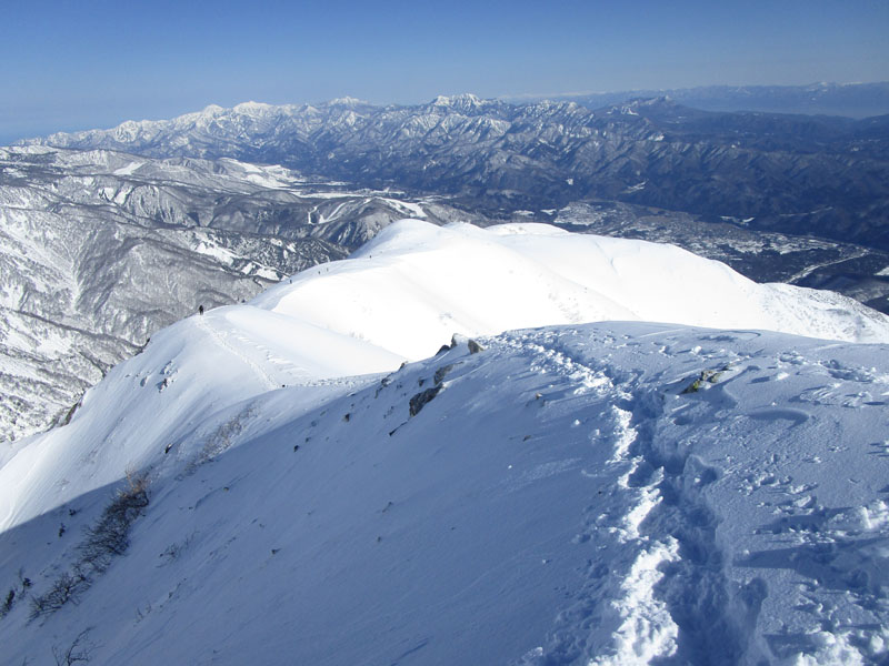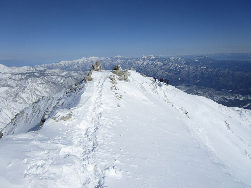 ここから先は稜線が左右に切れ落ちているので、雪が硬いときは滑落に要注意。