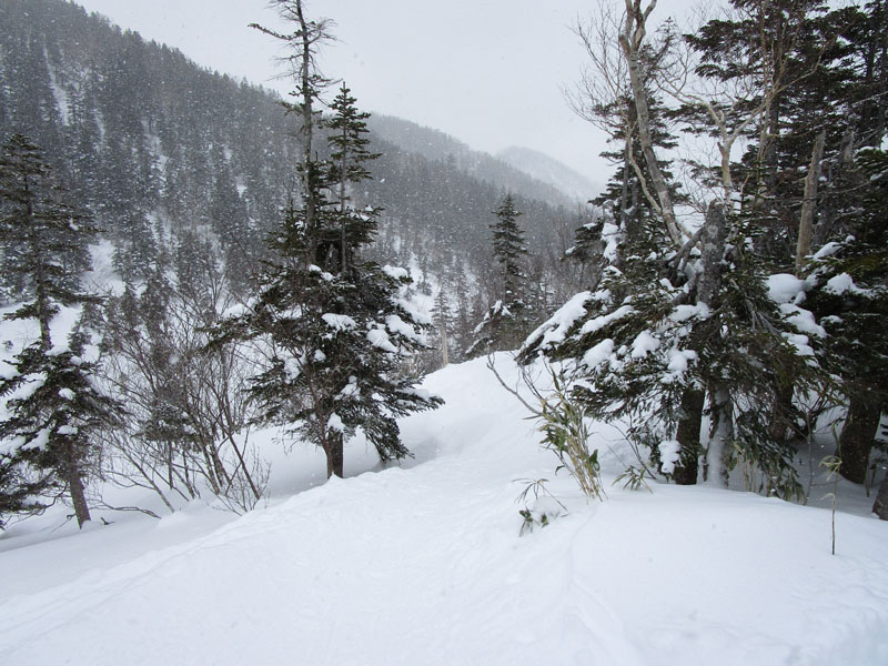 沢沿いは沢が埋まりきっておらず落っこちる恐れがある。