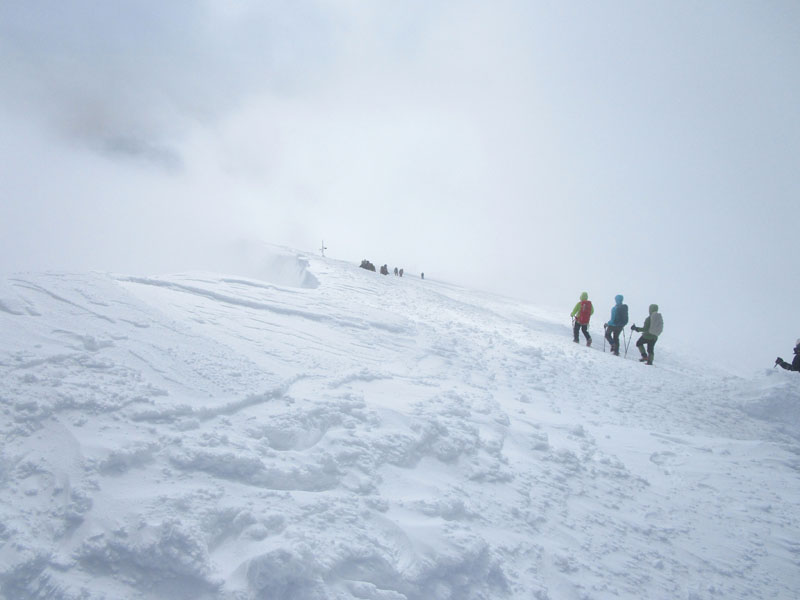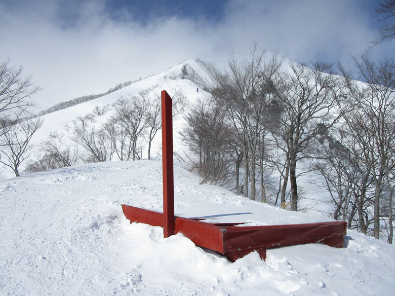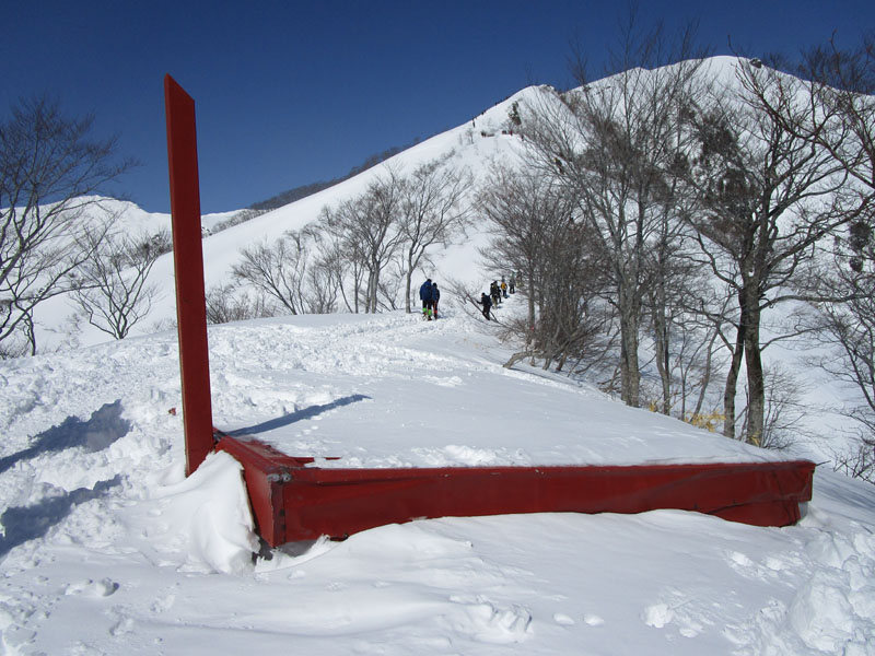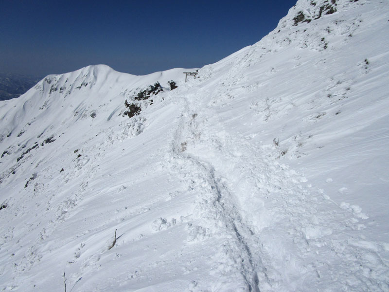 山頂から徒歩5分の奥の院を目指すが、雪が硬く、滑落に注意。