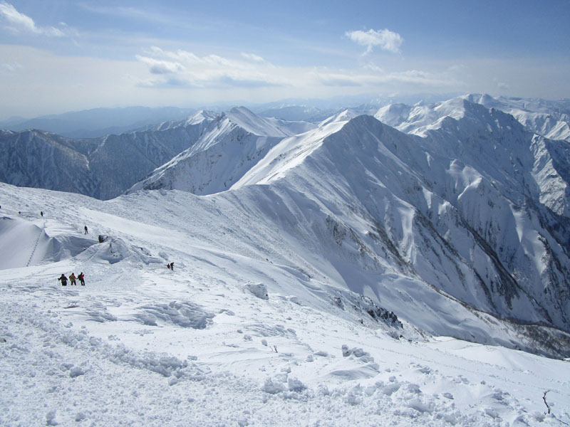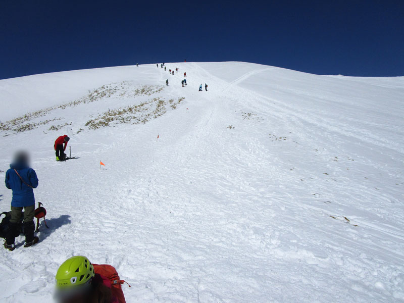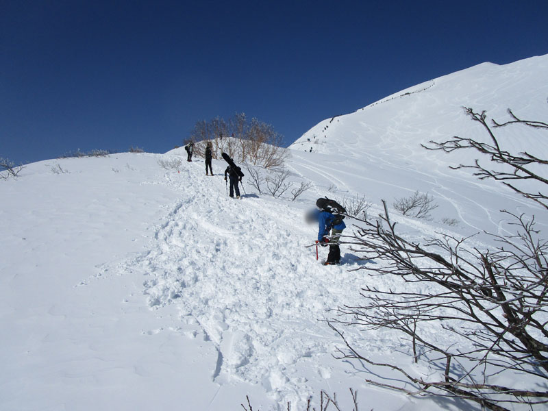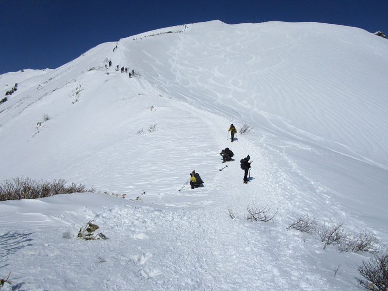 稜線上は風で雪が飛ばされるので、例年よりやや雪が少ない程度に見える。