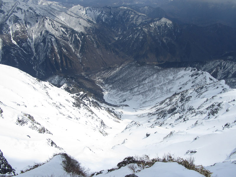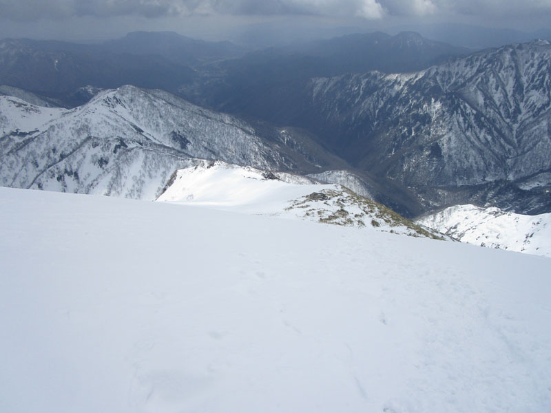 トマからマチガ沢を見下ろすとだいぶ下まで雪がつながっている。