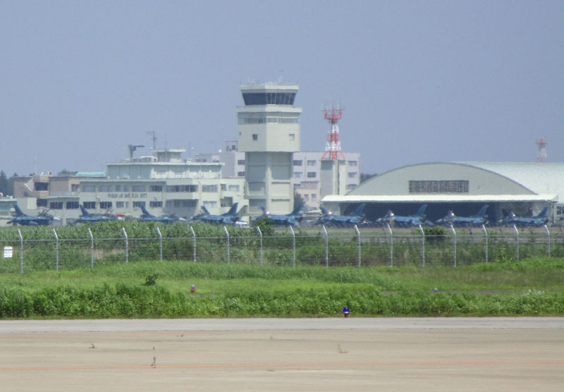 奥の自衛隊基地にはF-2戦闘機が大量に並んでいる。