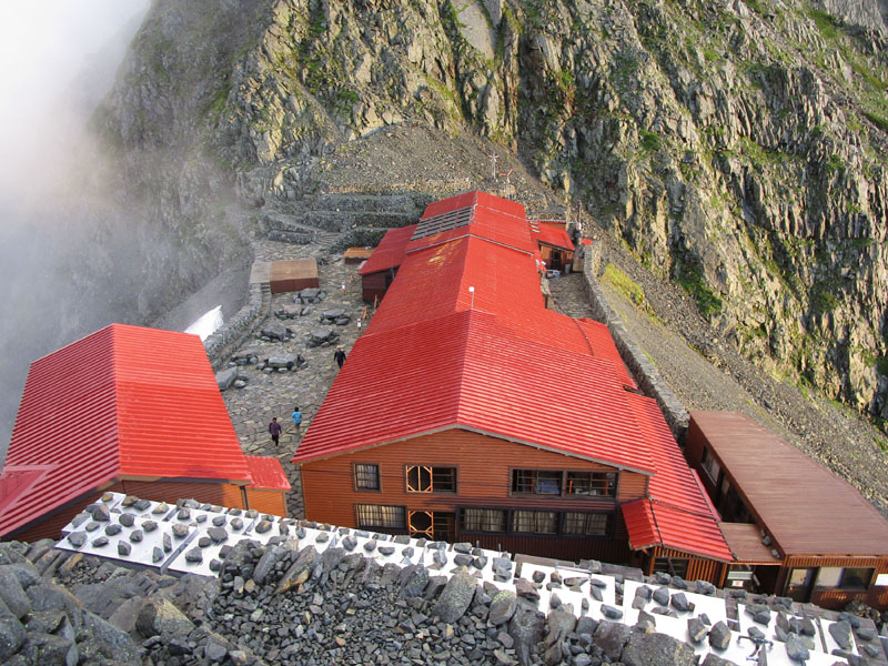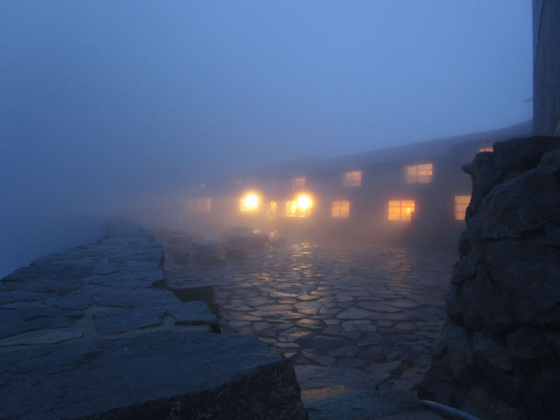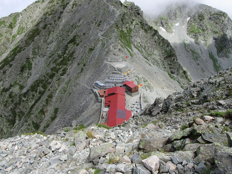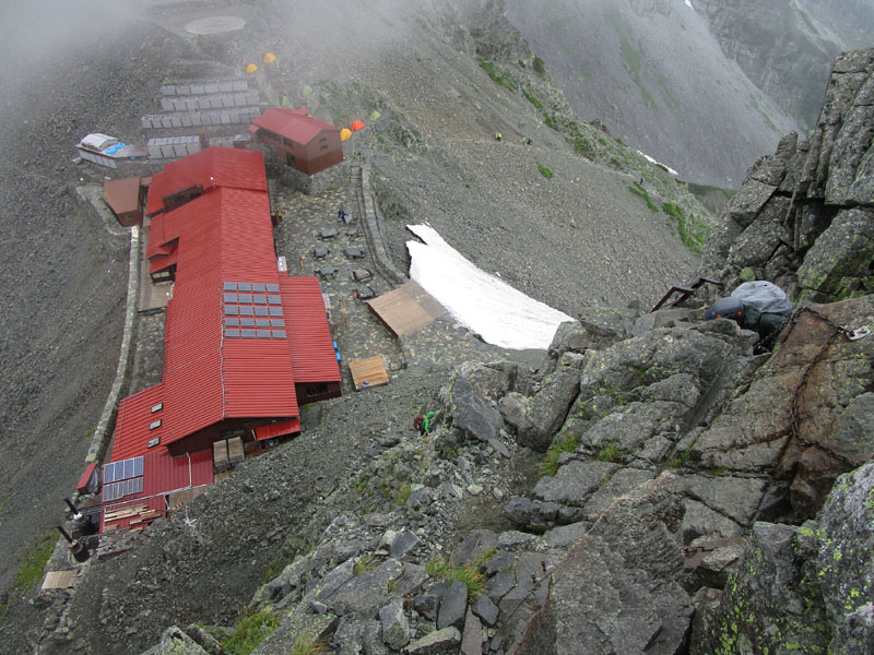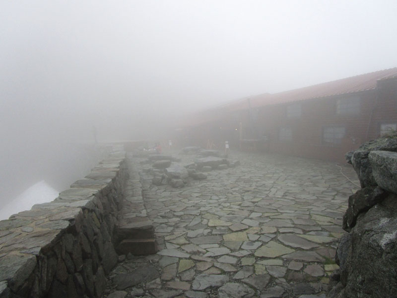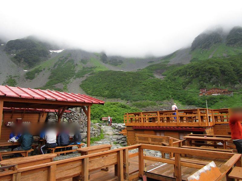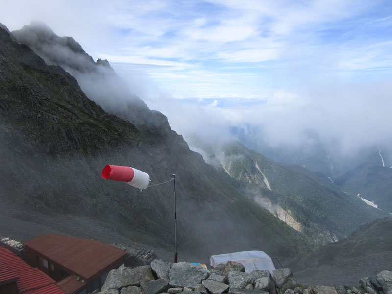 涸沢ヒュッテに到着。標高2,310m。穂高岳山荘は雲に包まれている。