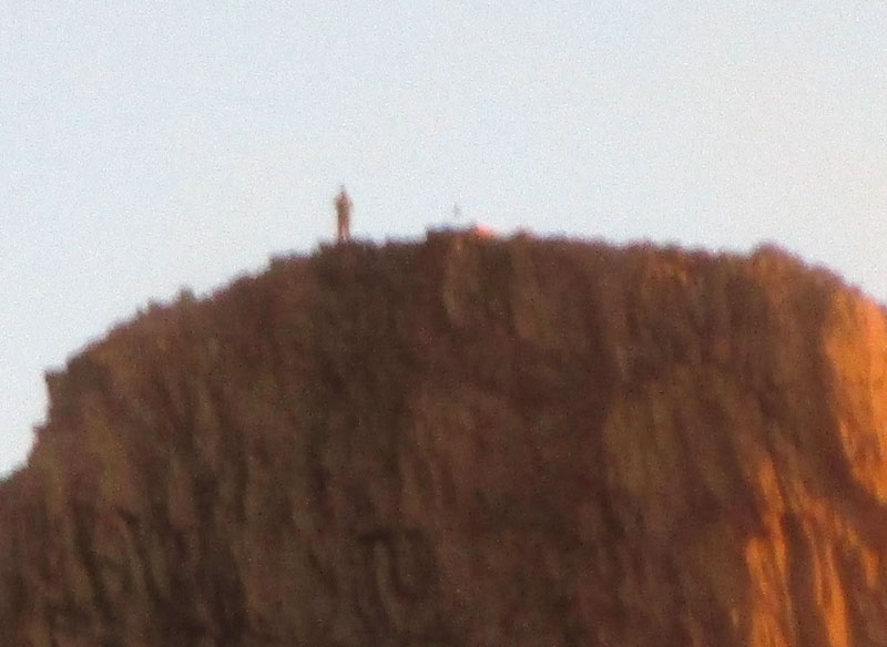 山頂標識の右下にテントらしきオレンジ色のものが確認できる。