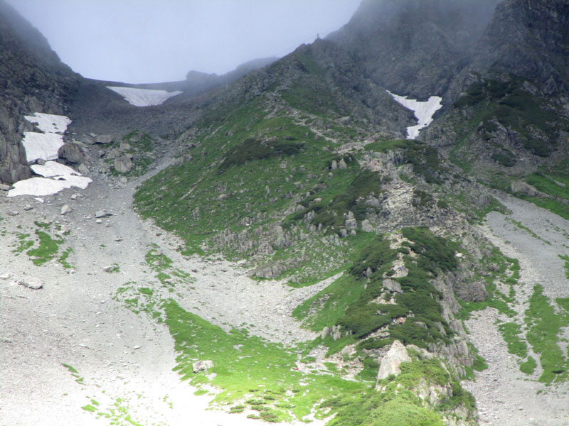 Sガレ(標高2,070m)まで来ると涸沢ヒュッテが見える。