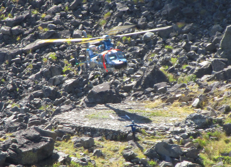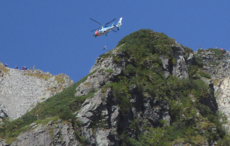 警察ヘリが稜線で救助活動中。