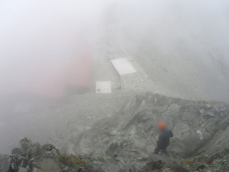 涸沢ヒュッテに到着。標高2,310m。穂高岳山荘は雲に包まれている。