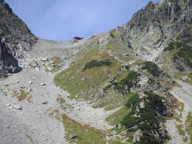 Sガレ(標高2,070m)まで来ると涸沢ヒュッテが見える。