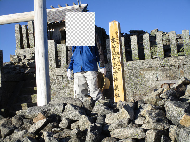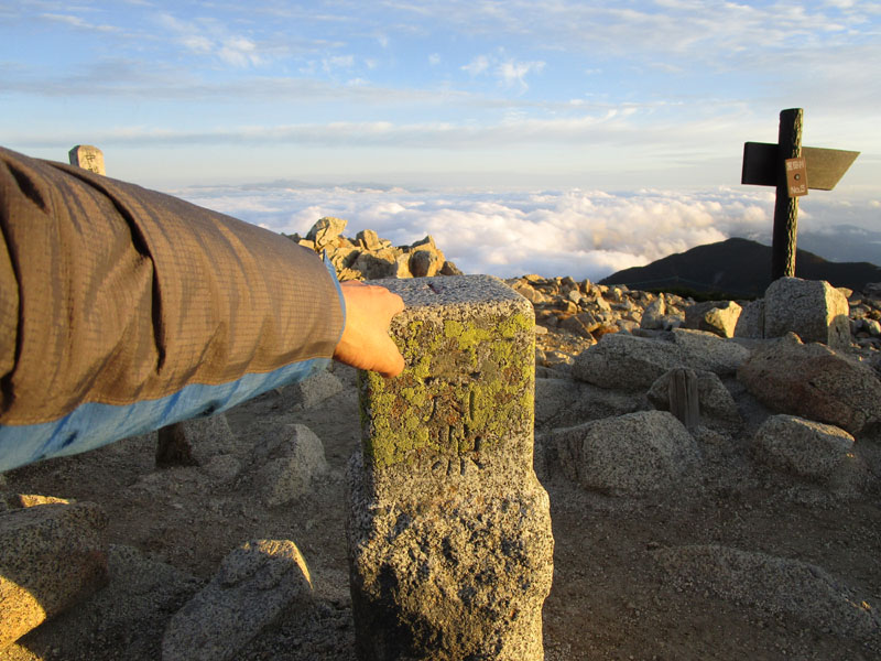 神社の頂上標識で記念撮影。4枚着てちょうどいいくらいの感じだな。