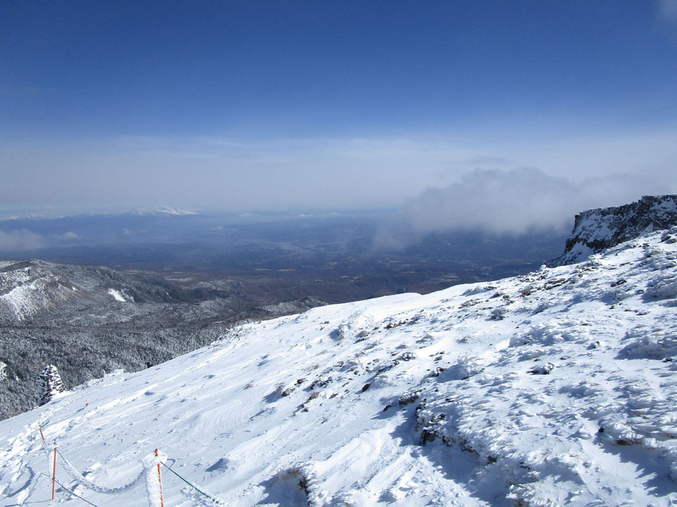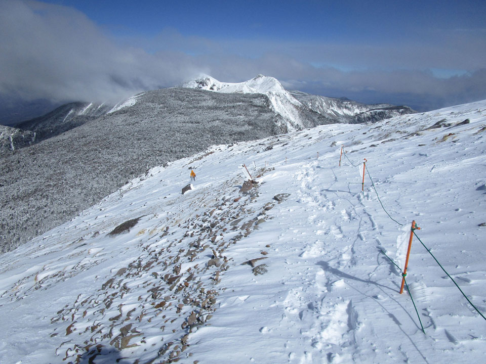 ここからは森林限界。雪が硬く、正規アイゼン+ピッケルが必要。