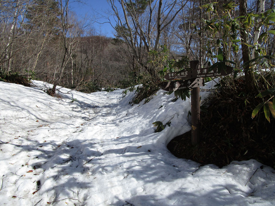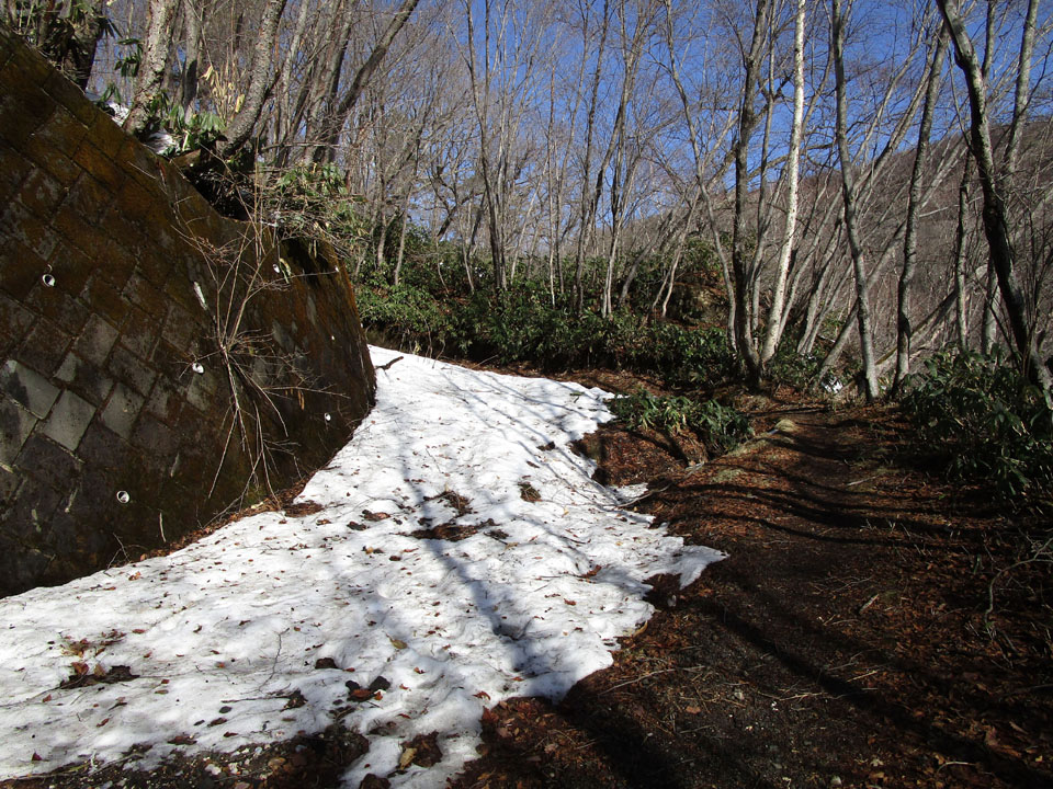 標高1400m付近から雪が出てくる。腐っていて大変歩きにくい。ワカンが有効。