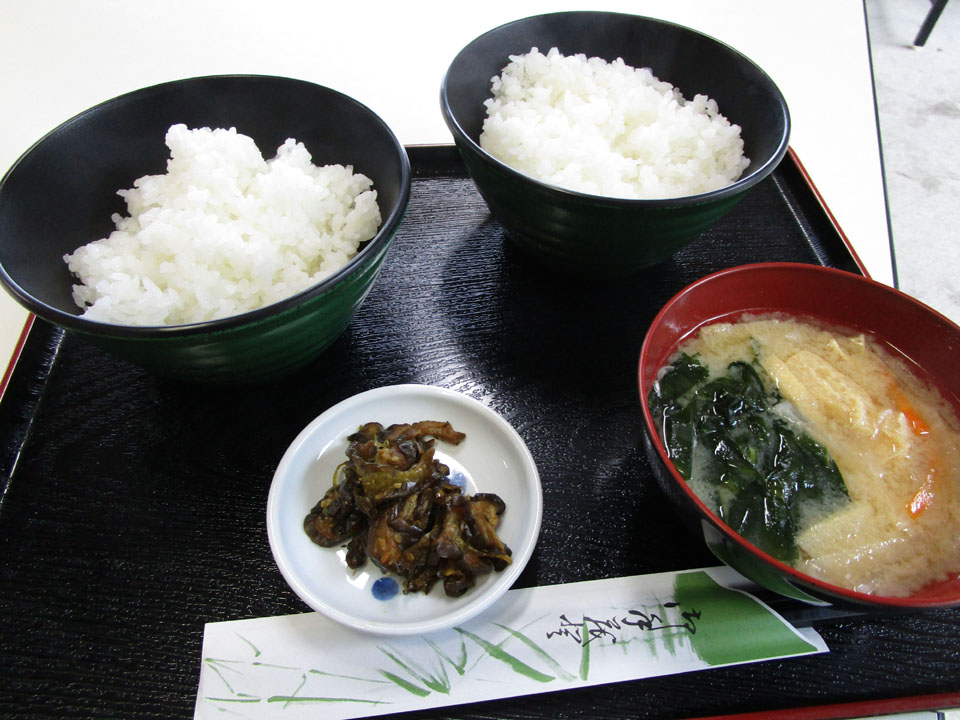 出発の前に補給する。ご飯マシマシご飯定食(オリジナル)。400円。