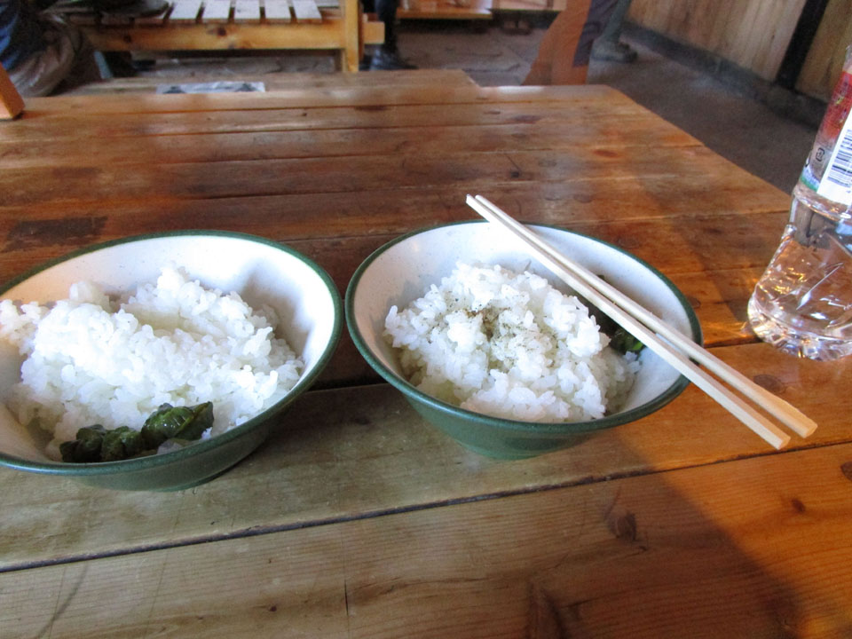 小屋で朝食。ご飯2杯で600円。