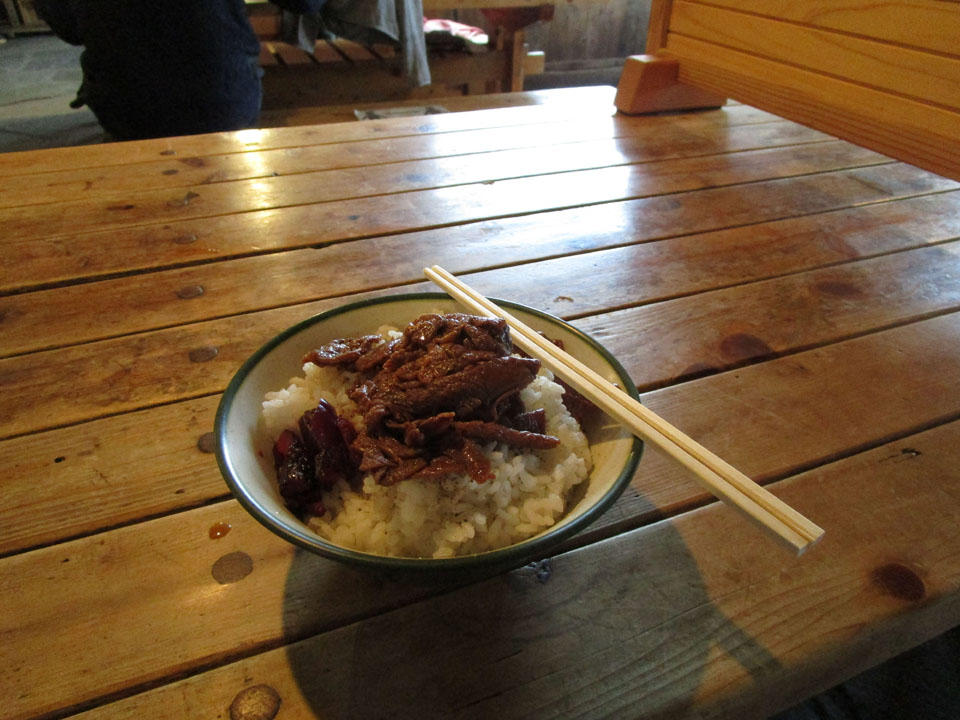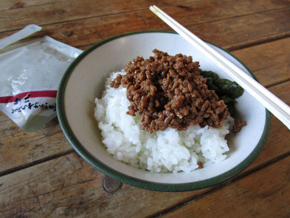 山荘では、ご飯を注文し、持参の牛肉そぼろをONして食べる。