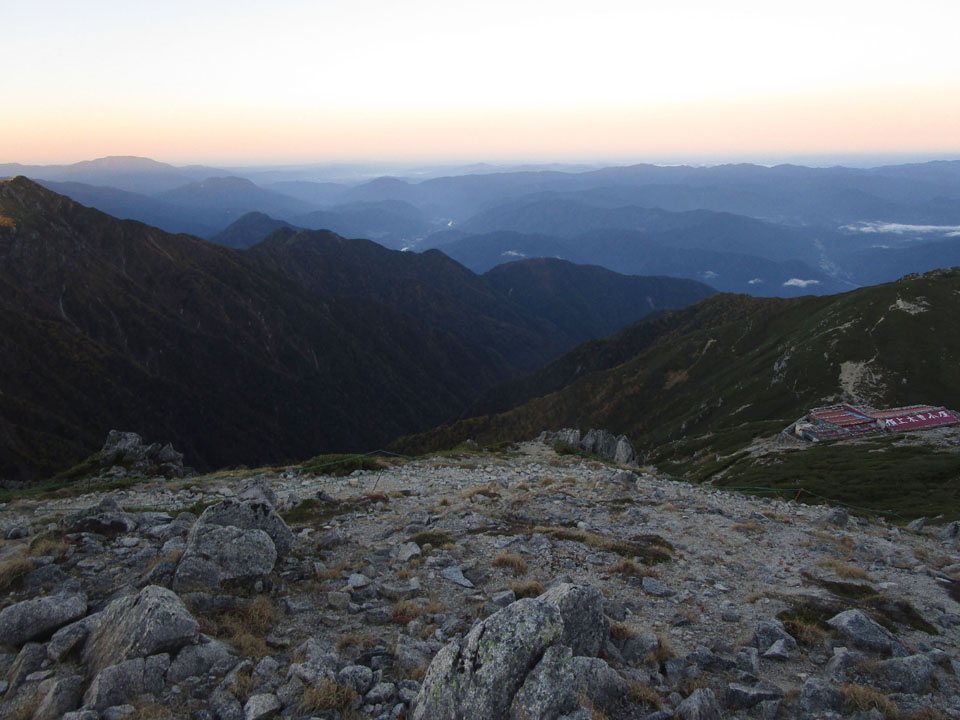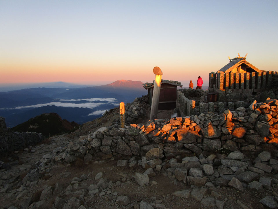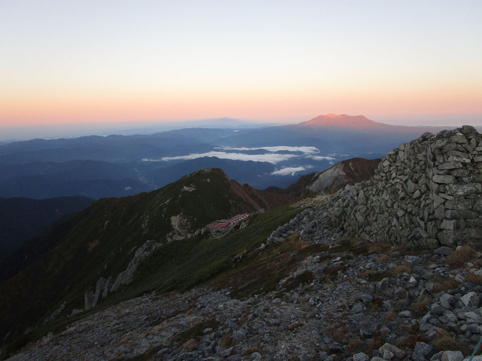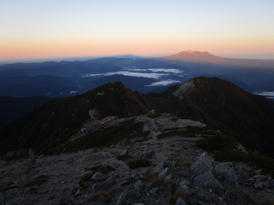 頂上木曽小屋はまだ影の中。