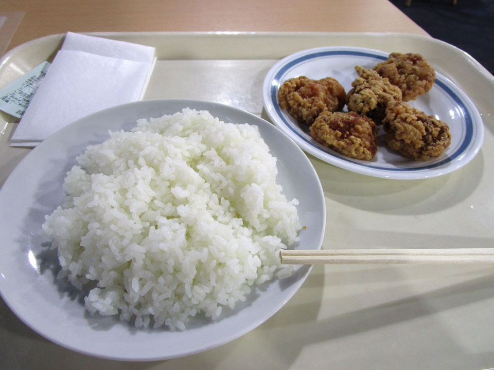 食堂で飯を食べる。唐揚げ定食状態にして1,000円。