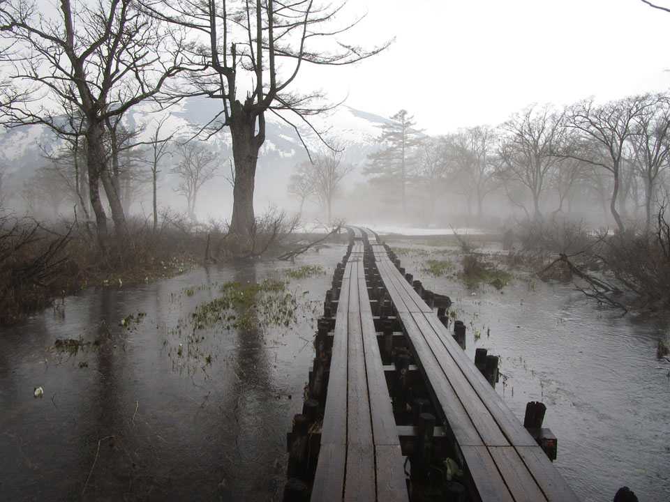 逆さ燧の池あたりで折り返す。これでも山ノ鼻から1.4km来ている。雨の木道は滑りやすくて注意。