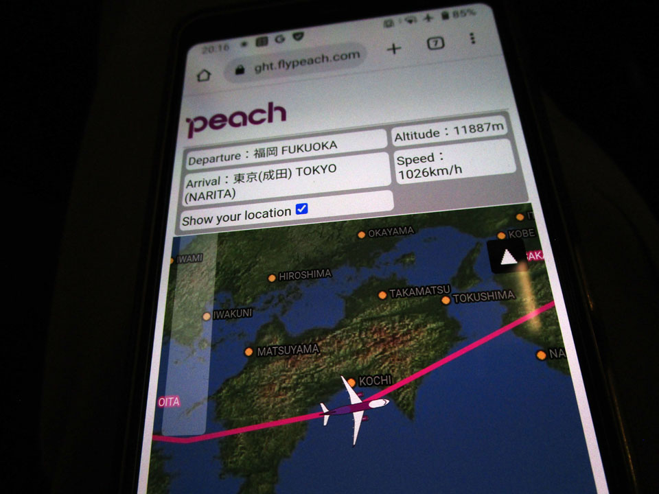 意外と、機内イントラネットが優秀で、こういうフライトマップや高度・速度が出て面白い。