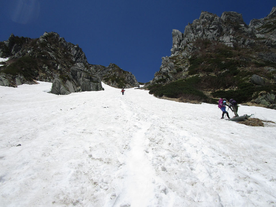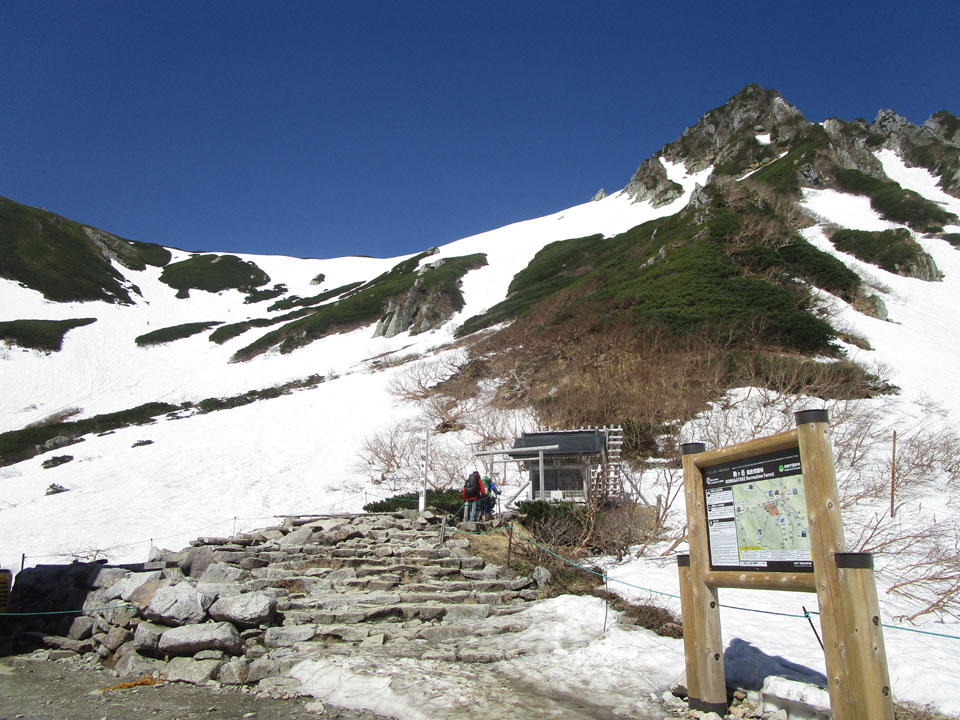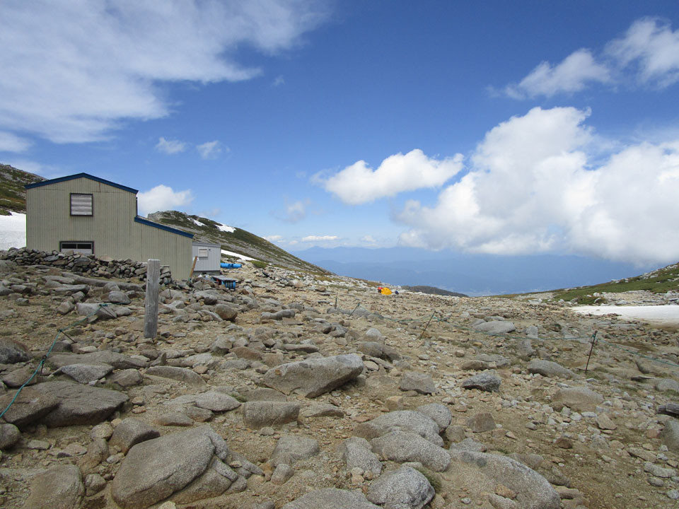 水場はないが、近くの雪渓から小川が流れているので、雑用水は調達可能。