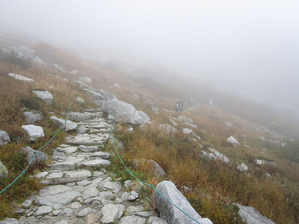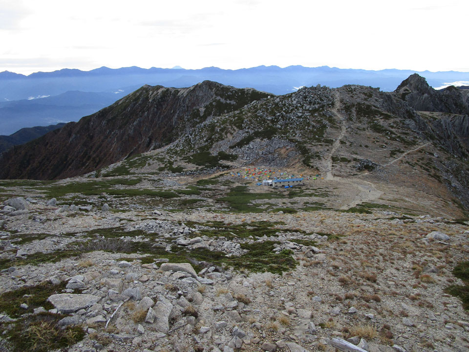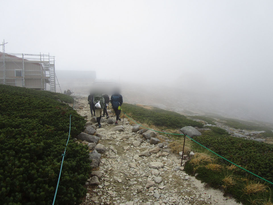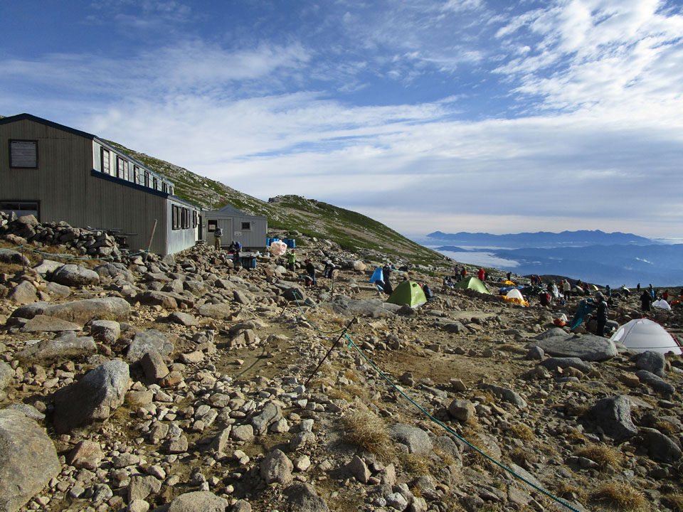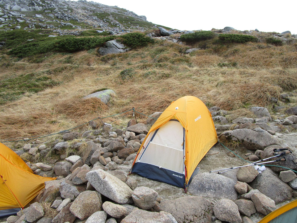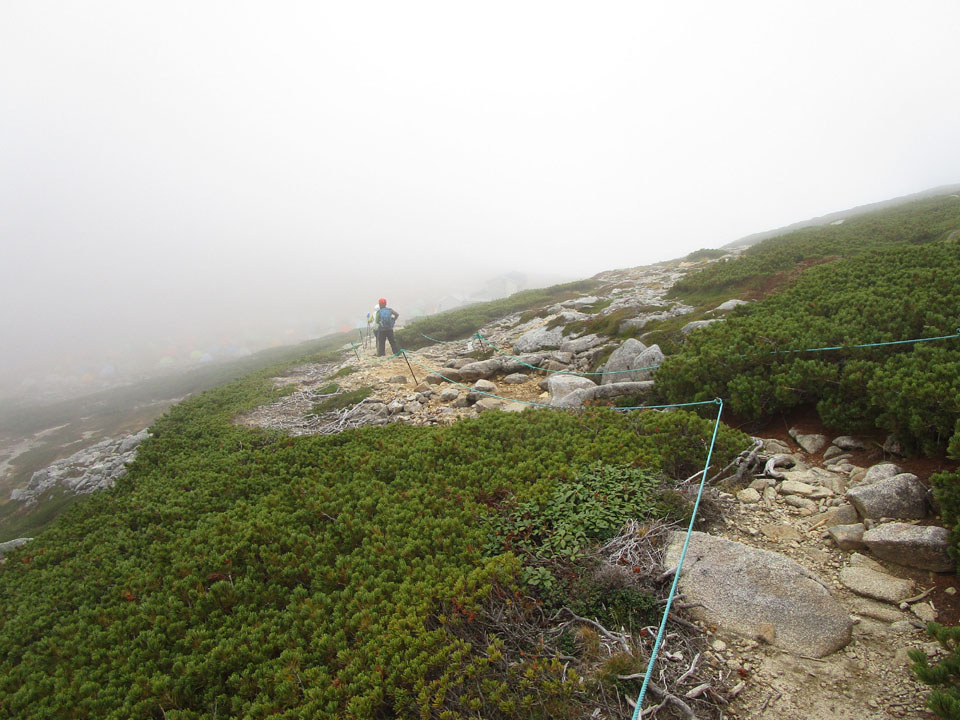 登山道側にあるグリーンロープで囲まれた範囲も幕営許可されるらしい。