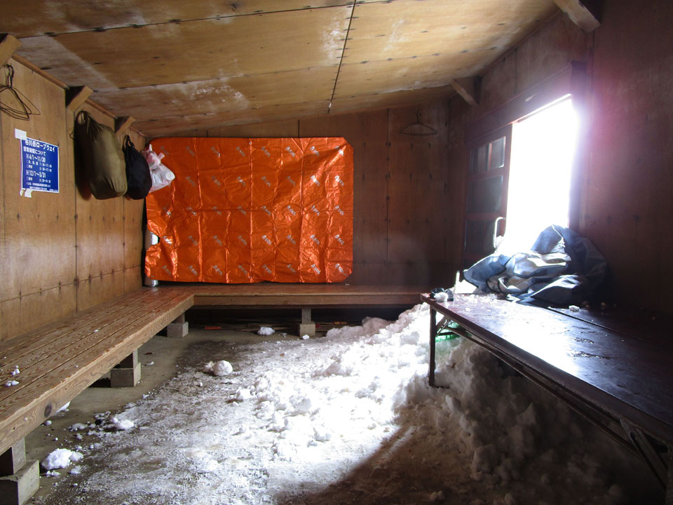 小屋はドアの戸締りが甘かったせいか雪が吹き込んでいる。