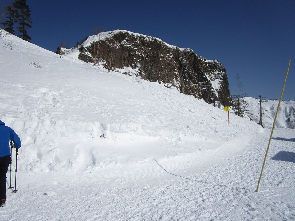 足を滑らせて左右に落ちないよう。雪が腐って滑りやすい。