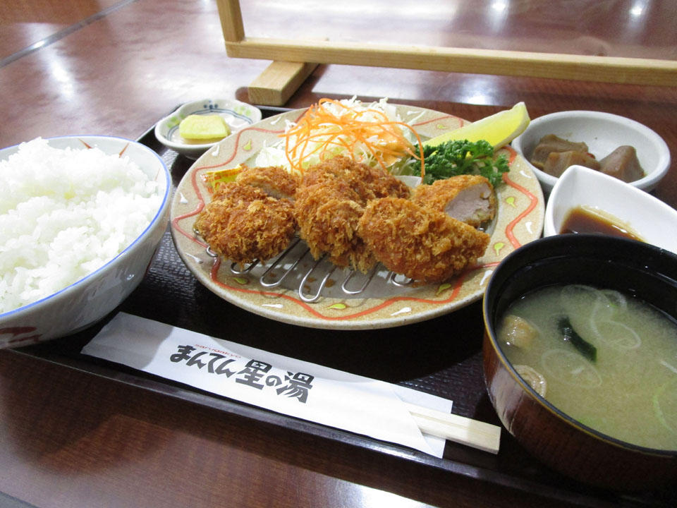 徒歩2分で「まんてん星の湯」という日帰り入浴施設。レストランで夕食にする。