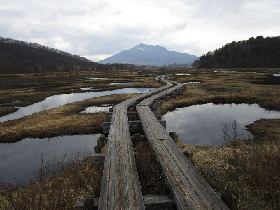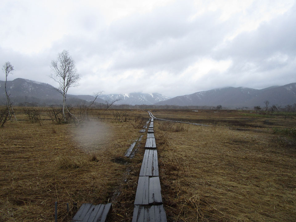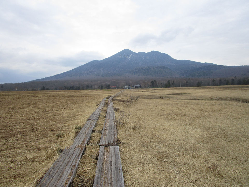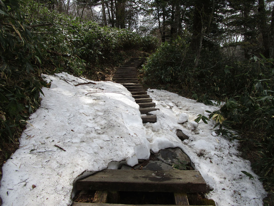 アイゼンは持参せず。木道にはほぼ雪はない(ほんの数歩)。