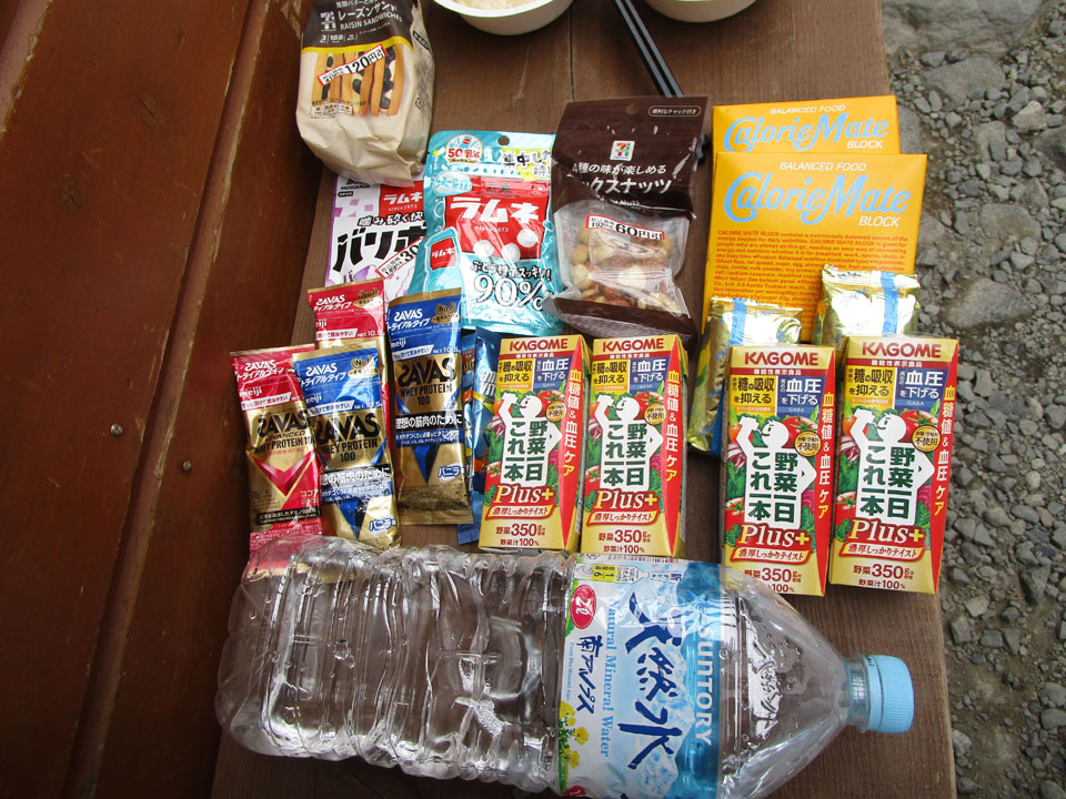 水は、穂高岳山荘500ml・400円+涸沢500ml・400円+横尾500ml300円+上高地500ml190円の計2L。