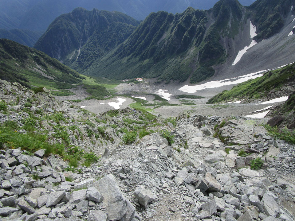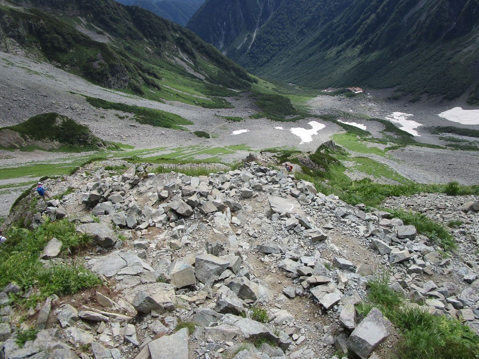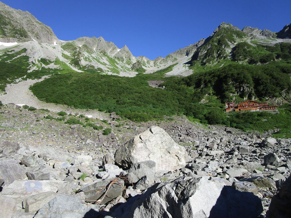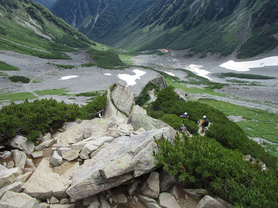 横尾まで降りてきた。ここまでくればほぼ下界。救急車も来れる(2時間以上かかるが)。
