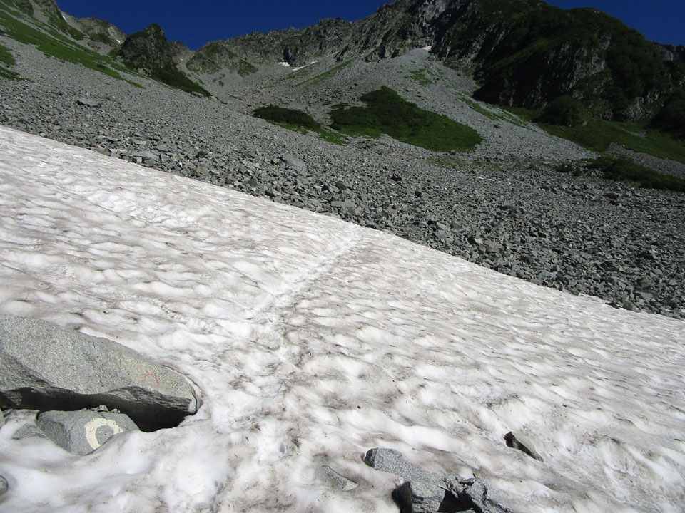 登山道上の残雪は、パノラマコース最上部で20mくらい、涸沢手前で残っているのみで、