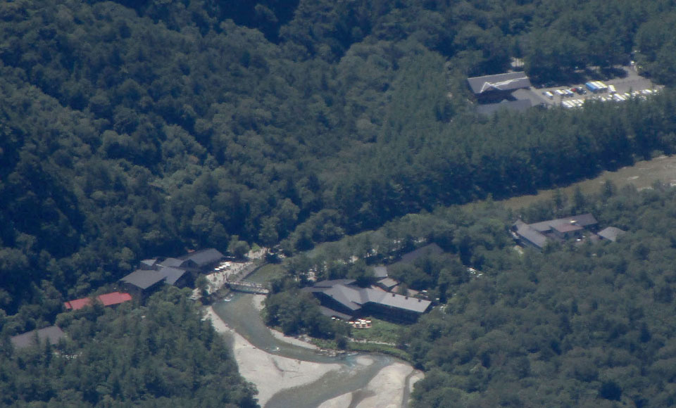 上高地バスターミナルが見える。拡大すると人もわかるのですごい。