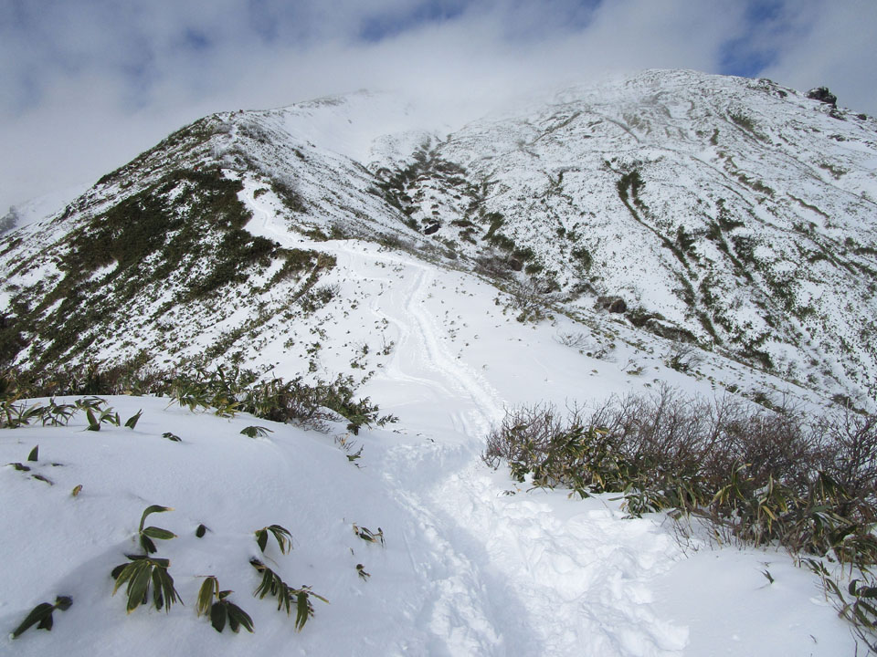 天神ザンゲ岩を過ぎると肩の小屋直下の大斜面。