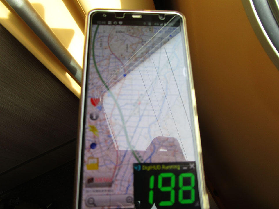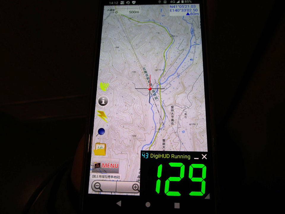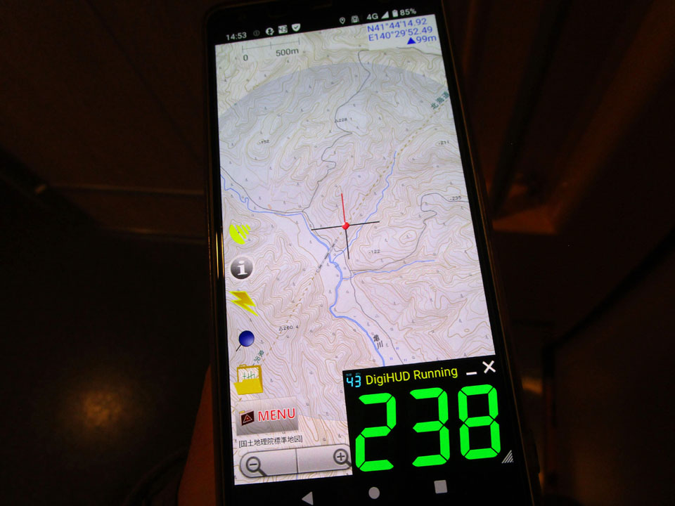 携帯端末で、国土地理院の地形図と、GPS速度計を表示すると、