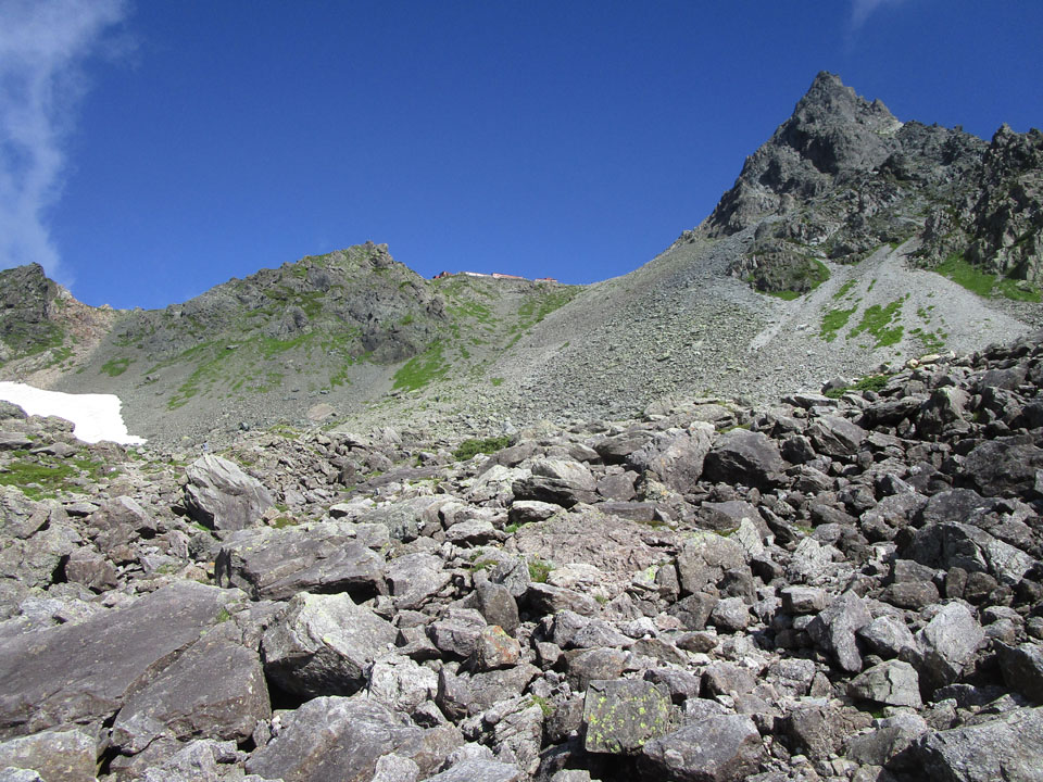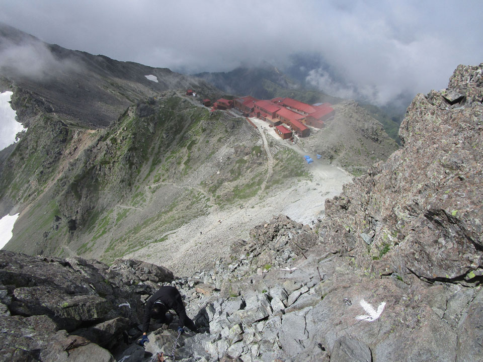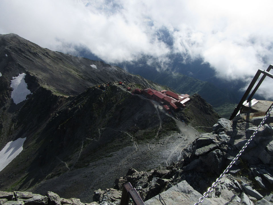 ここからは500m以上高い槍ヶ岳山荘が要塞のように見える。