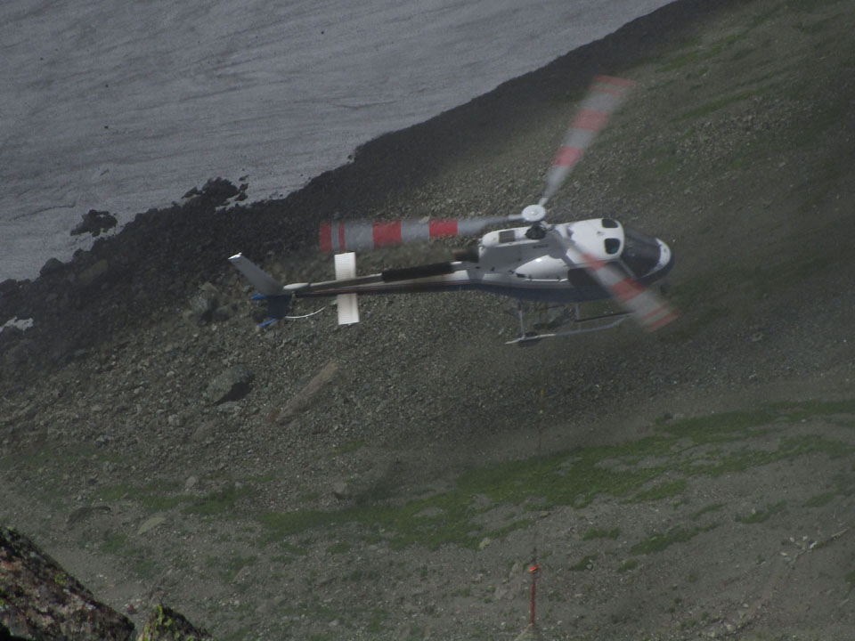 荷揚げのヘリが来た。この角度で飛行機が撮れるのすごい。