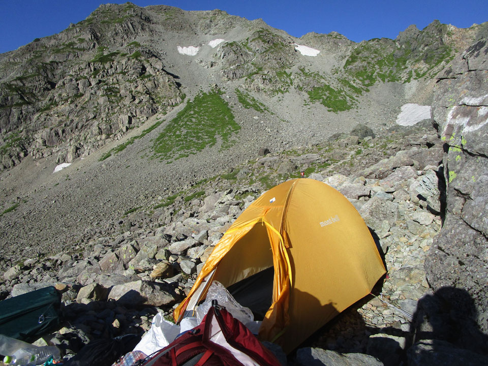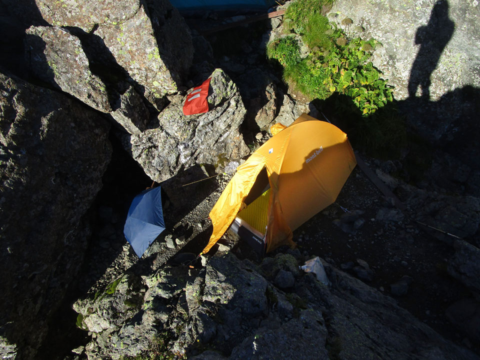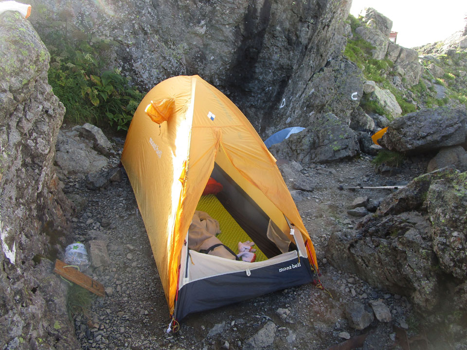 少し上のサイトでは、風でよく眠れなかった、という報告がヤマレコである。岩陰に設営するのが重要。