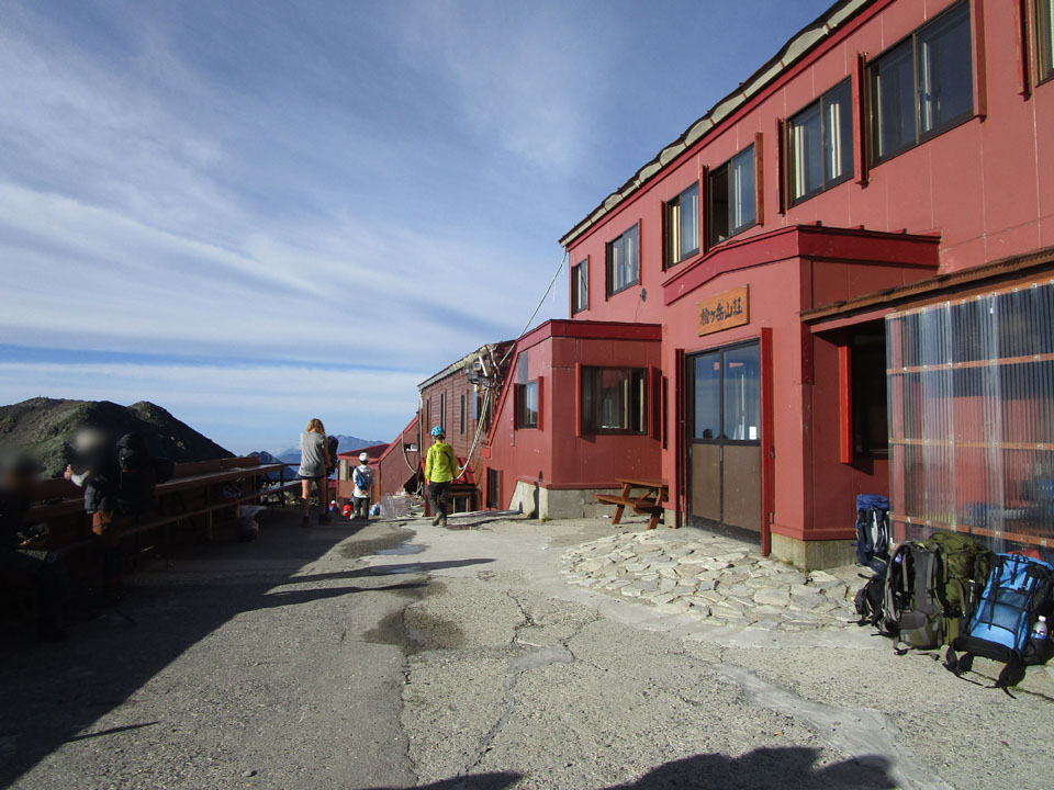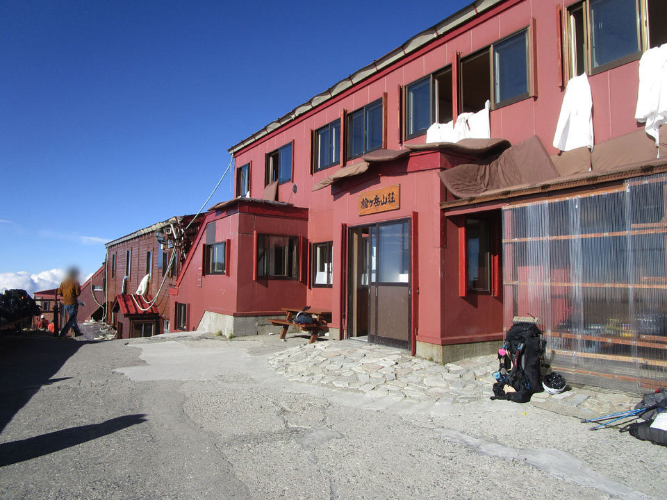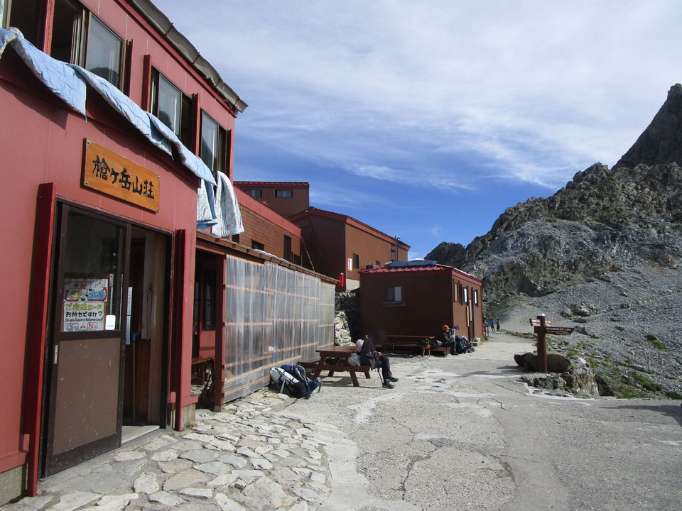 槍ヶ岳山荘の軒先は風雨・日差しが避けられるエリアがあり、ありがたい。