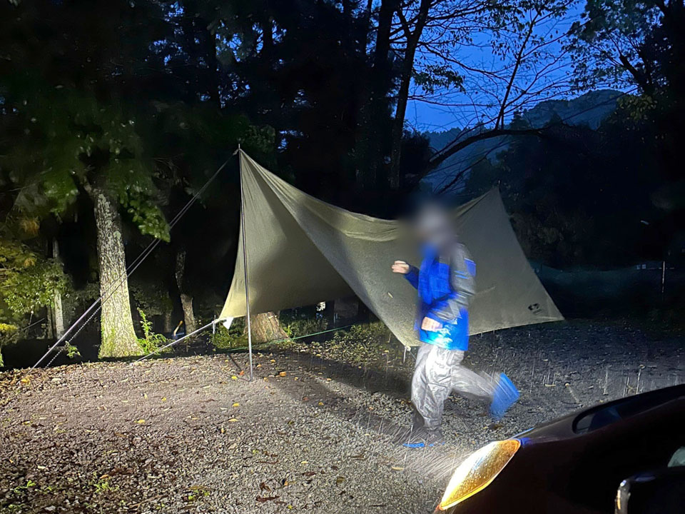 タープがあると、風がない雨には耐えられる。
