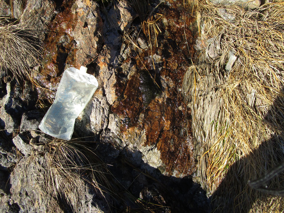 肩の広場の直下、標高1860m付近には、岩場の上を雪解け水が流れている場所がある。