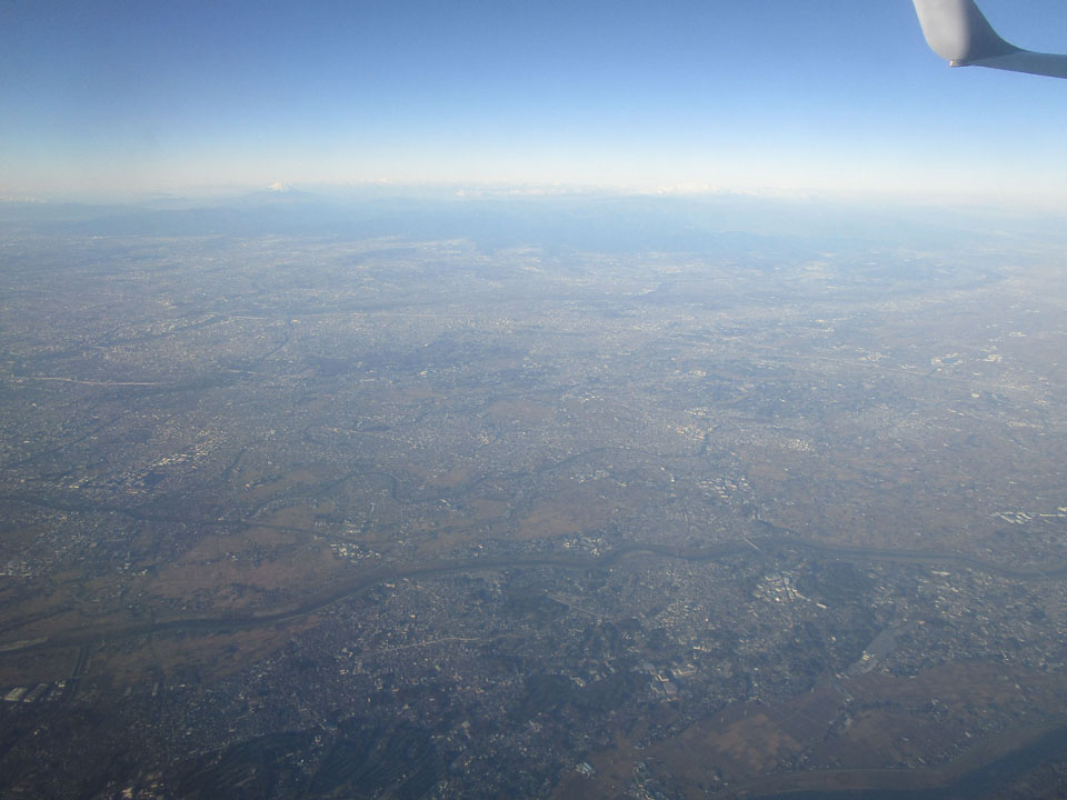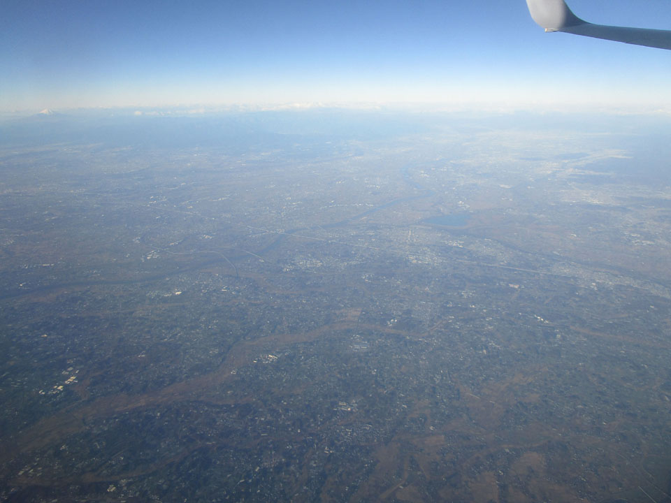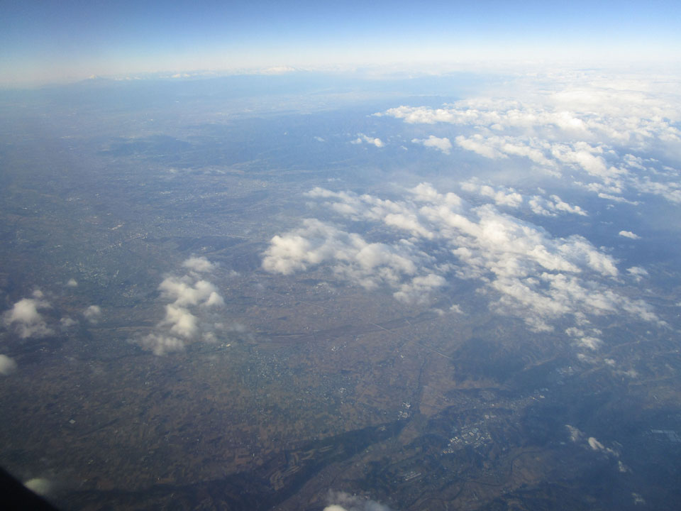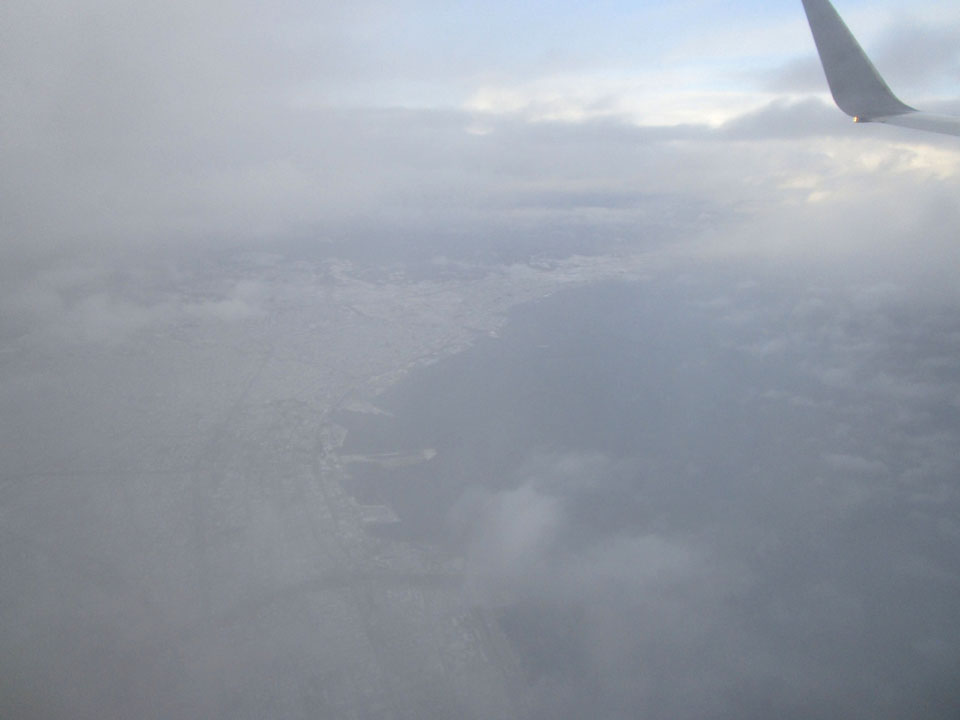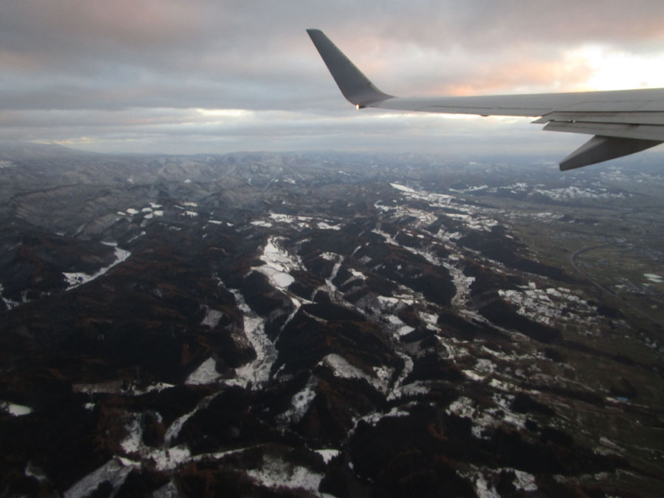 青森空港に向けて降下していく。基本的に雲の中だが、時折、景色が見える。