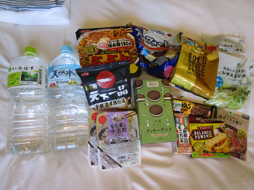 今回搬入食料。軽井沢駅前のコンビニで買ったものだ。食糧費は2200円ほど。