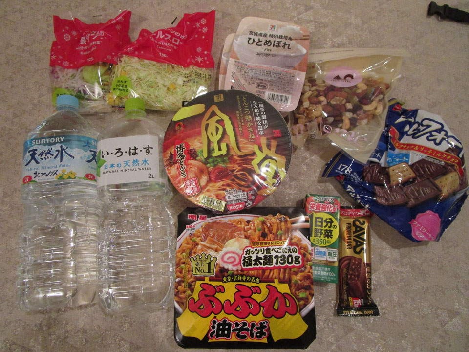 今回搬入食料。軽井沢駅前のコンビニで買ったものだ。食糧費は2200円ほど。