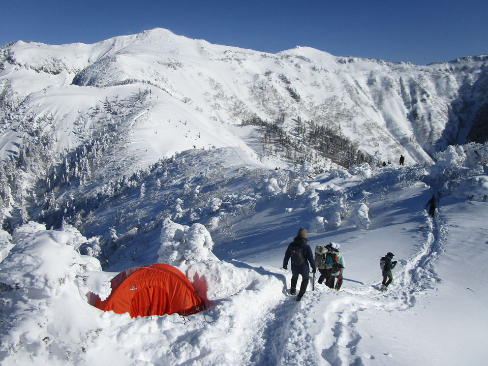 荷物を背負って登山靴で滑れるかはやや疑問が残る(靴もデポする方法もある)。