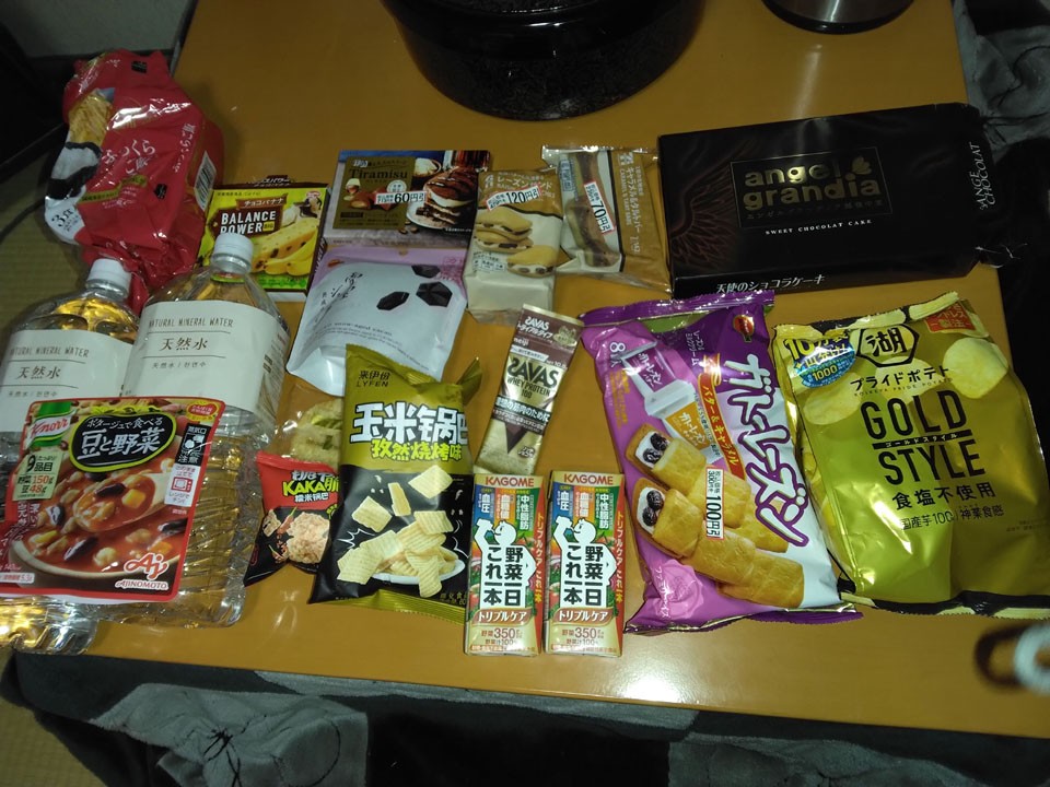 今回搬入食料。素泊まりなのでたくさん持参した。
