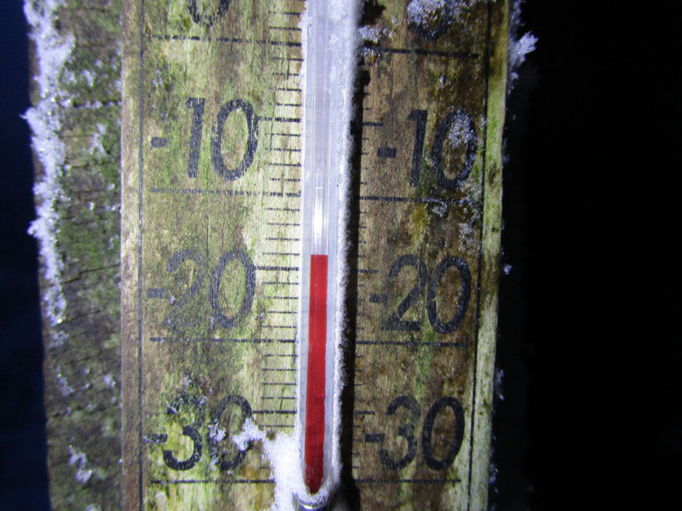 最低気温は‐14℃、室内で0℃程度と思われる(室内の水は凍らず)。