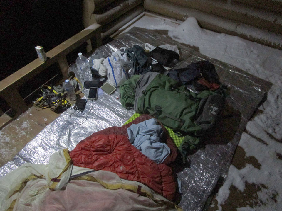 モンベル0(-15℃まで)+シーツ+上下ダウン+ホッカイロ6枚+マット2枚でぬくぬく。